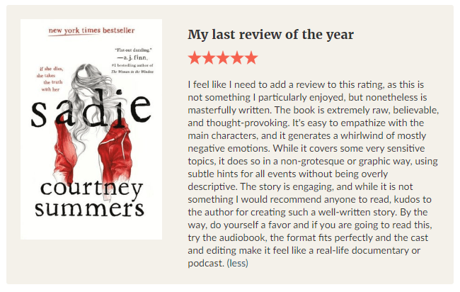 This is a tough one. If you like crime documentaries, this is a great (fiction) book. It is however a mixed-feelings type of read. It is accompanied by a freaking podcast, and if you listen to the audio book, it evokes a “War of the Worlds” deja vu, where you could probably believe it is a real account. I won’t say much, but you can read my review and the synopsis below.